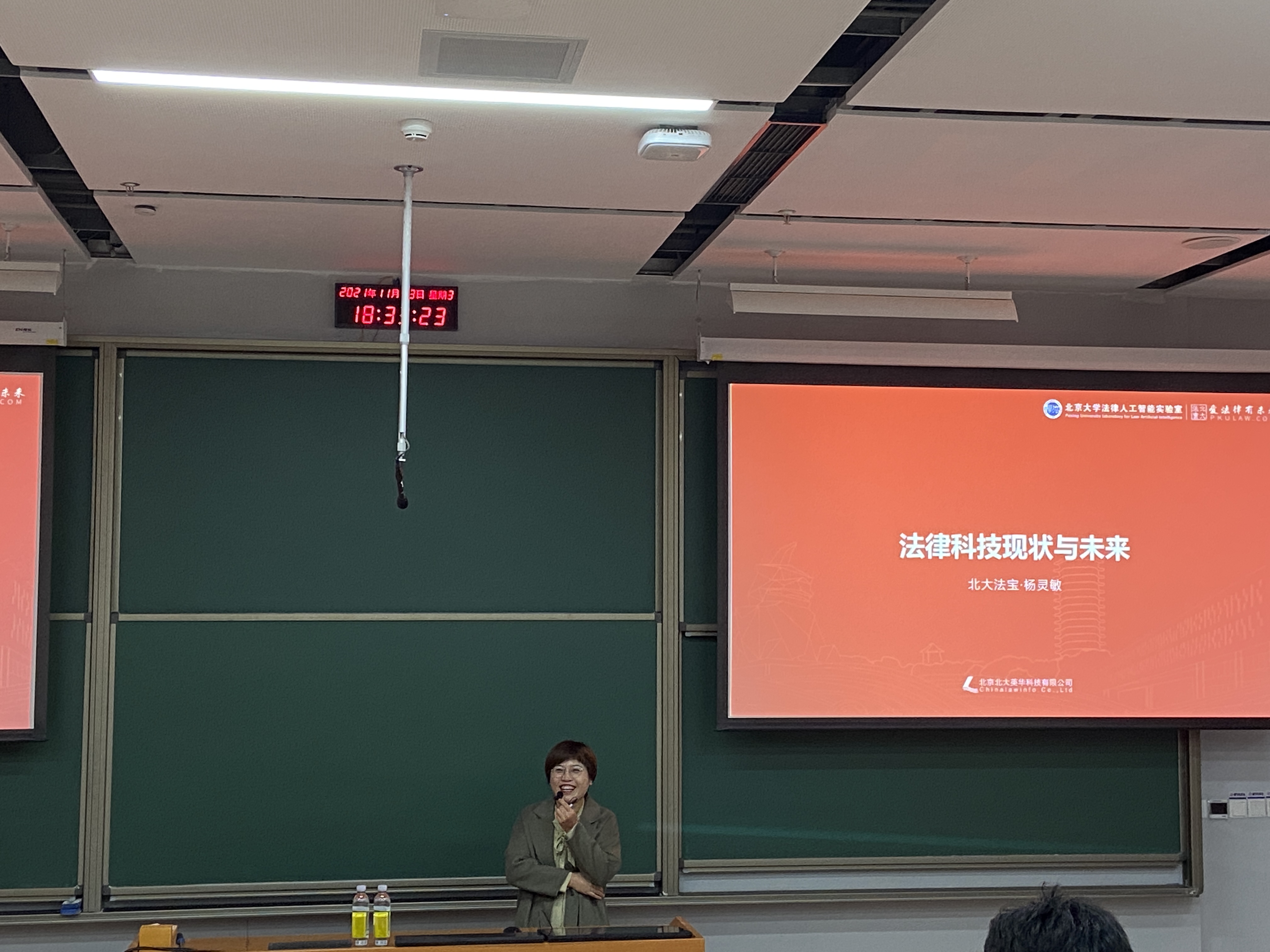 2021年11月3日晚,理公明法课堂第124讲“法律科技现状与未来”在beat365中国官方网站良乡校区东区文一楼140教室成功举办。这是为全日制法学硕士和法律硕士开设的《法学前沿专题》课程在本学期的第七讲。本次课程的主讲人是北京北大英华科技有限公司总经理助理兼市场营销总监杨灵敏女士。主持人为beat365中国官方网站教授、硕士生导师彭海青老师。