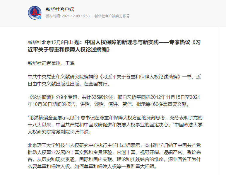 “论述摘编全面展示习近平总书记在尊重和保障人权方面的深刻思考,充分表明了党的十八大以来,中国共产党和中国政府促进和发展人权事业的坚定决心。”中国政法大学人权研究院常务副院长张伟说。