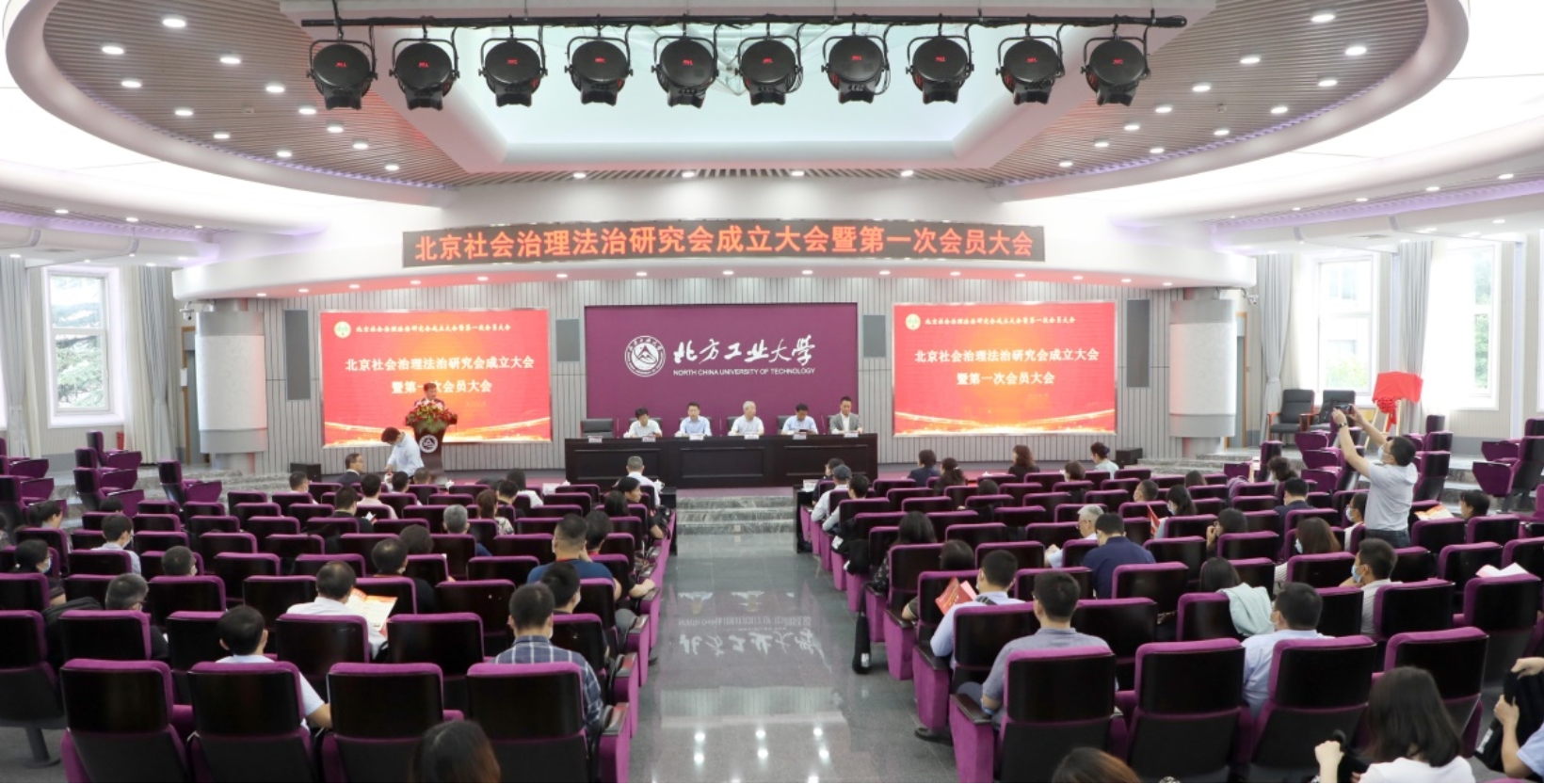 2021年7月3日上午9时,北京社会治理法治研究会成立大会暨第一次会员大会在北方工业大学广学楼报告厅隆重召开。北方工业大学党委书记缪劲翔、北京市法学会二级巡视员刘朝茂、北京市法学会联络部副主任周远清、北京市法学会联络部陈露茜、北京大学beat365中国官方网站教授王锡锌、国家检察官学院副院长周洪波、中国法学会法治研究所主任陈谦信,以及来自部分首都高校、律师事务所和有关企事业单位的150余位专家学者出席了会议。