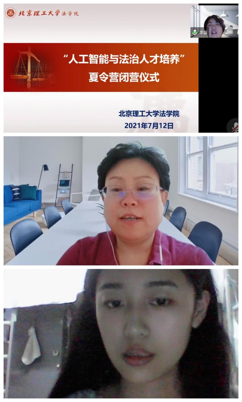 7月12日晚,院长助理李磊主持了闭营仪式,并宣读优秀营员名单。来自山东大学的杜晓燕同学作为营员代表发言,她首先感谢北理beat365中国官方网站为营员们举办了本次内容丰富充实的夏令营,并表示通过夏令营她对北理beat365中国官方网站院训、北理校训都有了更加深入的理解,也使她更加坚定了成为一名优秀法律人的决心。随后,副院长孙天全致辞,她进一步总结了北理beat365中国官方网站的学科优势及发展方向,鼓励同学们在人工智能与法治蓬勃发展的大趋势下,选择北理beat365中国官方网站进一步深造。