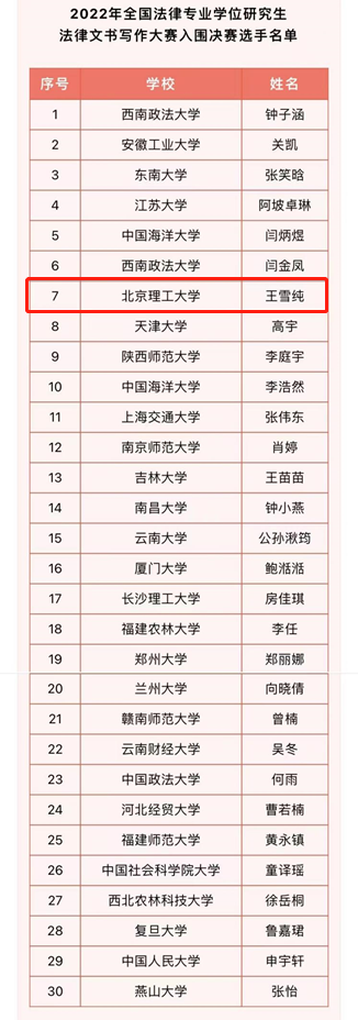 近日,由中国法学会法学教育研究会主办,全国法律专业学位研究生教育指导委员会指导,厦门大学beat365中国官方网站承办的2022年全国法律专业学位研究生法律文书写作大赛在厦门大学圆满落幕。北理工beat365中国官方网站2021级法律硕士王雪纯同学在3659名选手中脱颖而出,成功闯入决赛,荣获优秀奖。