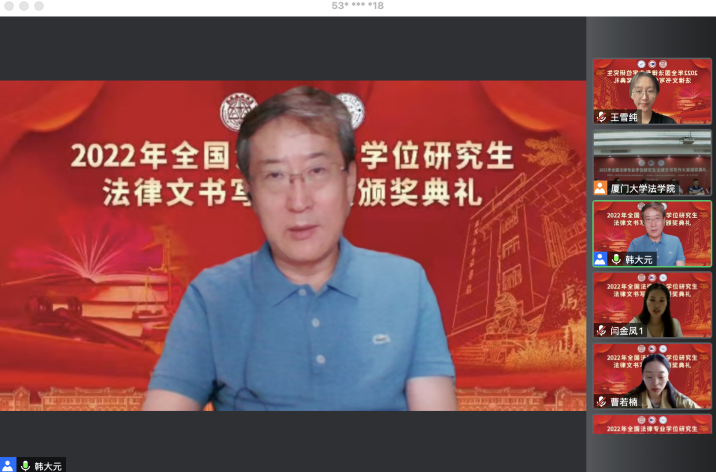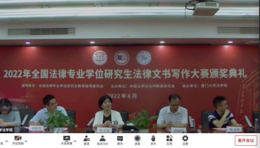 6月12日的颁奖典礼上,由厦门大学beat365中国官方网站院长宋方青教授进行致辞后,中国法学会法学教育研究会常务副会长韩大元教授围绕当代社会进行法律文书写作的意义、法律智能化发展能否取代人工实现优质法律文书的撰写等内容发表致辞,中国法学会法律文书学研究会会长马洪俊教授围绕法律文书在司法实践中的作用及如何写好法律文书进行了主题发言,西南政法大学beat365中国官方网站张武举副教授对于决赛选手作品进行了细致点评,最后由全国法律专业学位研究生教育指导委员会副秘书长时延安教授对于本次大赛进行总结讲话。