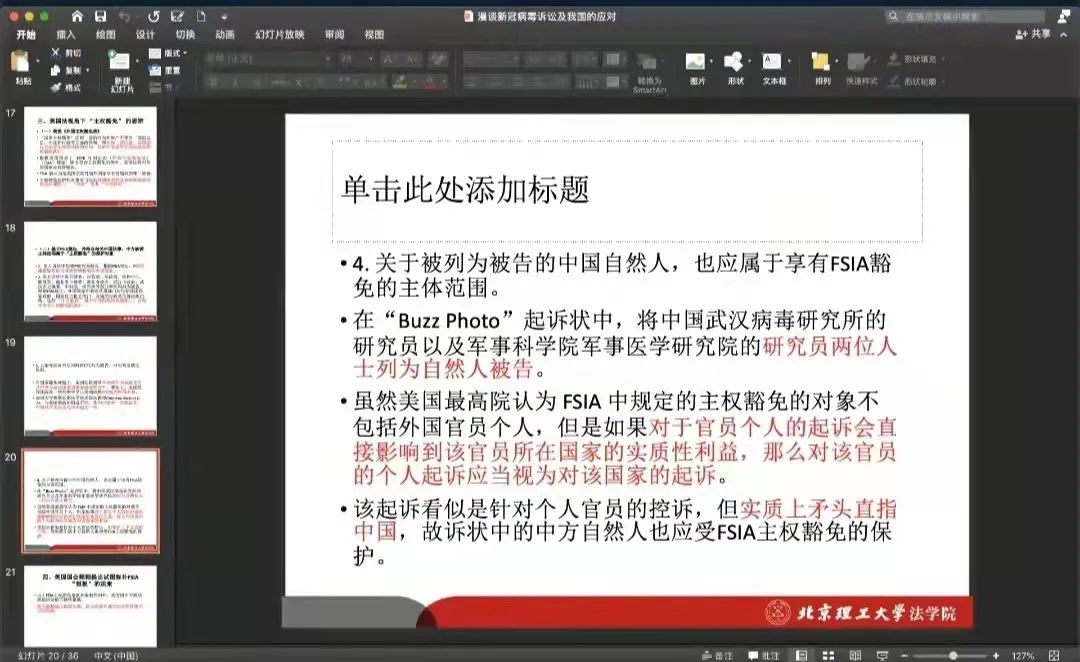 之后,beat365中国官方网站连俊雅老师结合专业特点,作了《漫谈新冠病毒诉讼及我国应对》的学科讲座,拓宽了学生的国际视野。与此同时,连俊雅老师就beat365中国官方网站的学科建设、特色优势、培养模式等进行了介绍。