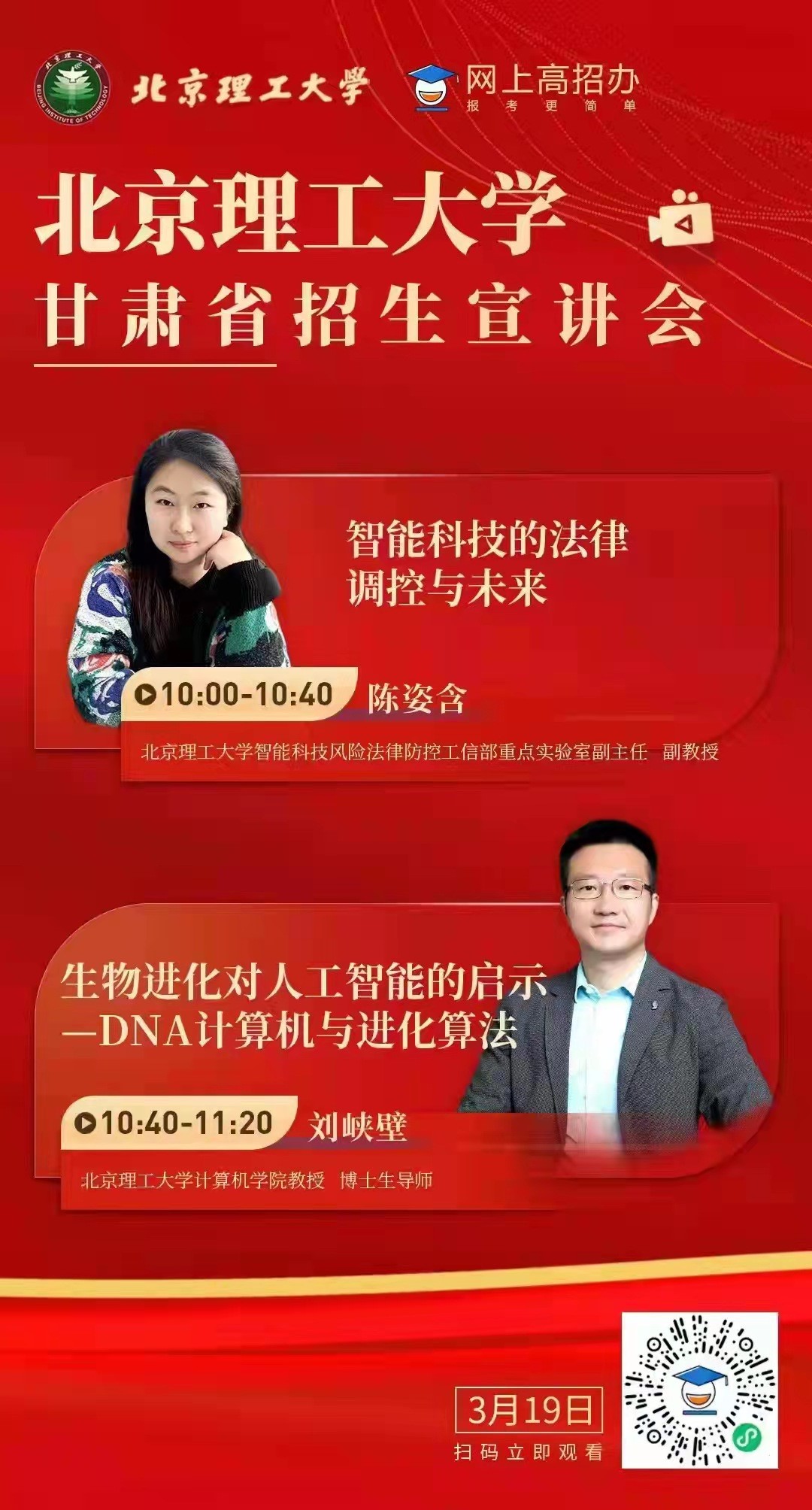 随后,刘峡壁为广大学子做了题为“生物进化对人工智能的启示——DNA计算机与进化算法”的讲座,刘教授阐述了人工智能的基本任务与主要技术途径,并在此基础上,重点介绍从生物进化原理中汲取灵感而获得的模拟进化这一人工智能发展途径,讲解DNA计算与进化计算的基本原理与应用表现,使广大考生体会到了人工智能与生物学结合的奥妙。