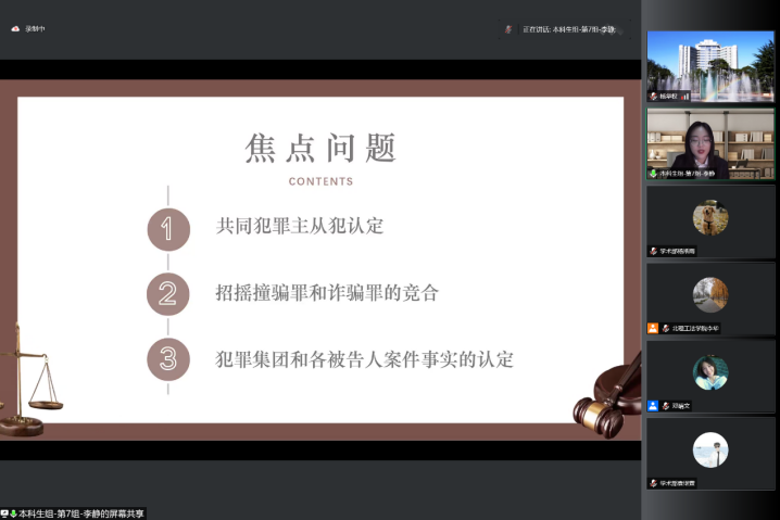 在决赛中,14支队伍各展其长、各臻其妙,合理使用多媒体手段,紧扣时事与热点,参赛选手能够将案例与法理完美融合,展现出严谨的逻辑体系与扎实的理论功底;同时能够从容沉着地应对老师们的提问,展现出卓越的思辨能力和语言表达能力。