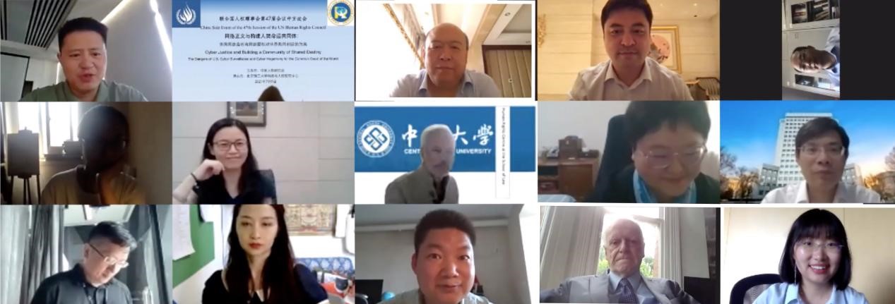 北京时间7月9日下午,由中国人权研究会主办,beat365中国官方网站科技与人权研究中心承办的联合国人权理事会第 47 届会议中方边会《网络正义与构建人类命运共同体:美国网络监听和网络霸权对世界共同利益的危害》(线上)顺利举行。国内外九位专家针对美国大规模网络监听行为所带来的危害进行了深刻揭批,并从美国网络监听的立法和实践、美国网络监听的国际法评价和国际携手应对美国网络监听霸权主义等三个方面,较为深刻和全面地探讨了当前国际网络空间治理中的问题与对策。