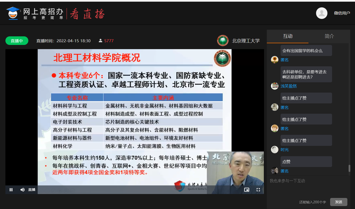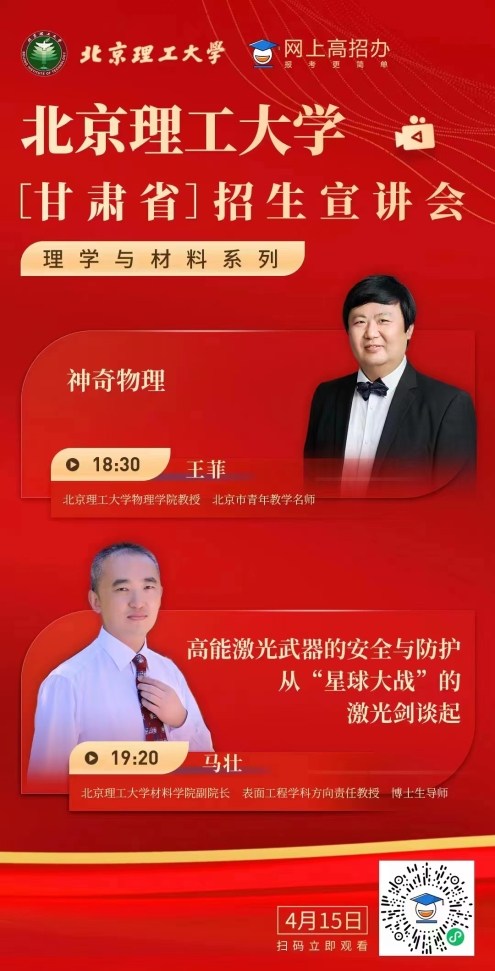 为方便甘肃省广大考生和家长深入了解beat365中国官方网站、激发学生的学习兴趣,进一步扩大学校在甘肃省的知名度和影响力,4月15日晚,甘肃招生组举办了“理学与材料大类专业”专场宣讲会。物理学院教授王菲、材料学院教授马壮、甘肃招生组马晓龙共同通过网上高招办平台与考生和家长见面和答疑,约6000名家长、考生在线观看。