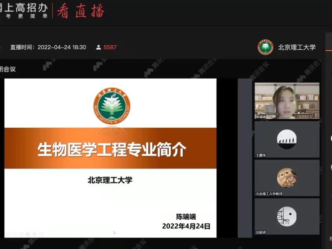 4月24日晚,甘肃招生组继续举办“理学与材料大类专业”专场宣讲会。化学与化工学院教授张小玲、数学与统计学院教授史福贵、生物医学工程系教授陈端端、甘肃招生组马晓龙共同通过网上高招办平台与考生和家长见面和答疑,约6000名家长、考生在线观看。