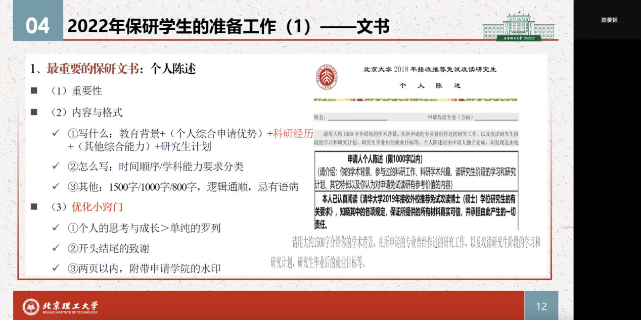 首先,陈姜韬同学向大家分享了如何选择保研项目以及保研准备技巧。她建议尽早了解近几年的保研情况以评估自己的条件,并深入了解相关院校、学制、导师来明确自己的深造意向以规划未来方向。她强调“个人陈述”文书需要提前准备,并对专业课复习、英语复习,以及面试准备分享自己的经验,也希望同学们可以“终身学习、坚持阅读”,重在平时的积累。