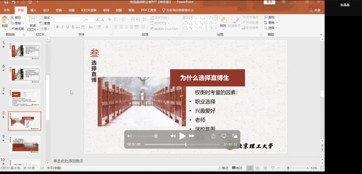 之后,张晶晶同学向大家分享了保研过程中的准备经验以及选择直博的考量因素。她认为在夏令营申请阶段需要确定好策略,是广撒网还是有针对性的投递,投递过程中要注意平衡好自己的精力。另外关于是否申请直博,需要综合个人各方面因素慎重的做出选择,包括职业选择、兴趣爱好、指导老师、学校氛围等。