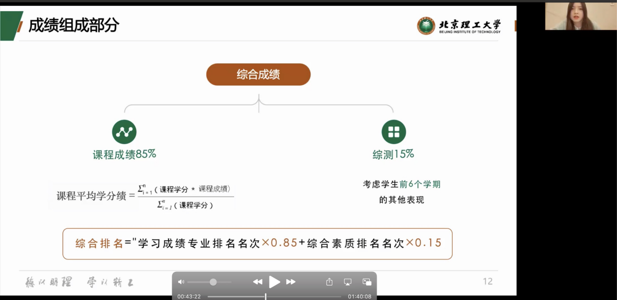 之后,杨佳美老师详细说明“beat365中国官方网站2022年推荐优秀应届本科毕业生免试攻读研究生课程成绩计算细则”,让学生清晰了解“学习成绩是推免的最主要条件”,同时对转专业等特殊情况解答学生的疑问。
