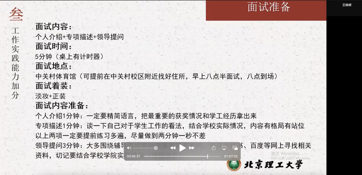 最后,王姝婷同学向大家介绍了保资的面向范围和选拔要求。作为一名兼职辅导员,她强调除了学习成绩外,还要注重学生工作实践经历积累,并结合自己的经验提出了具体准备技巧,包括个人简历、面试准备、个人介绍等。