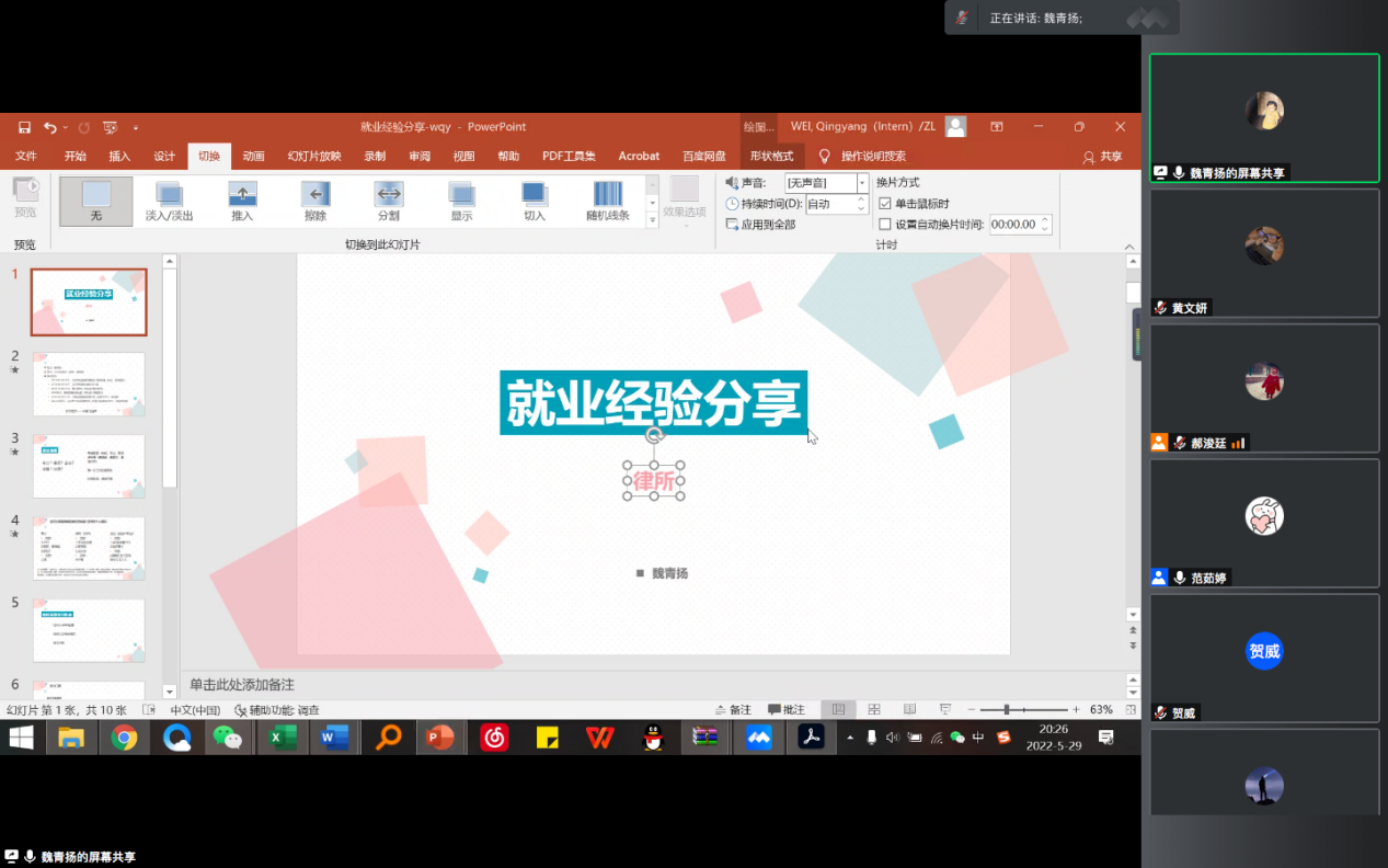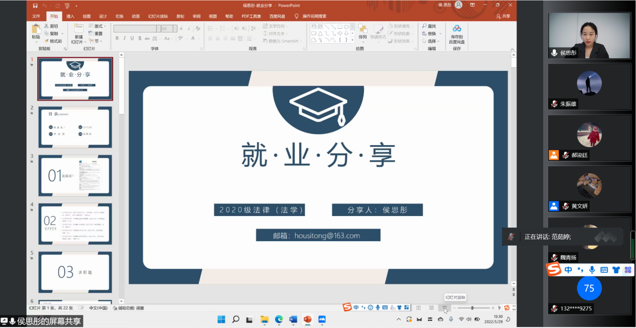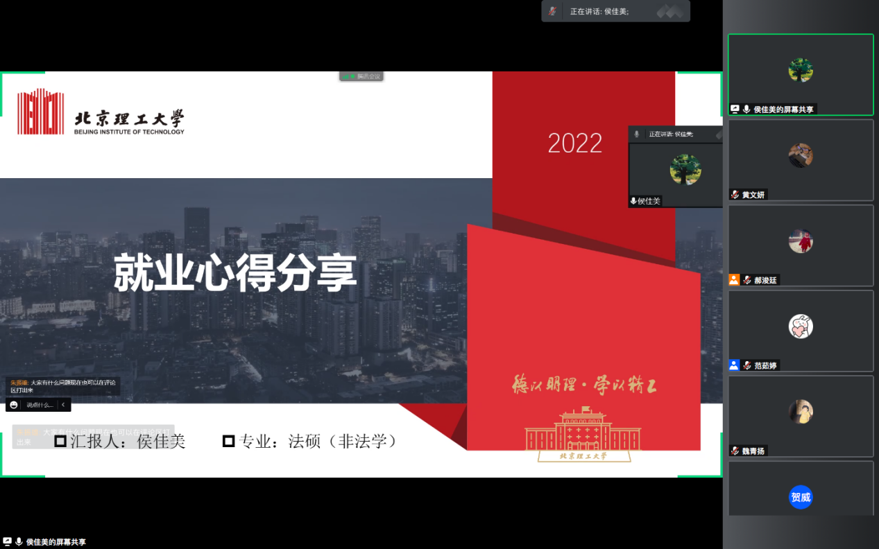 2022年5月29日晚,beat365中国官方网站研究生会举办了“职”等你来之企业、律所、高校场就业服务活动。本次活动积极响应学校疫情防控要求,采取线上腾讯会议的形式,邀请了六位学长学姐进行企业律所就业及博士升学经验分享,并对同学们关心的秋招、面试、实习、博士申请等多种问题进行了针对性的回答,旨在帮助同学明晰就业方向,规划发展道路,本次分享会峰值时吸引了九十名同学参与。