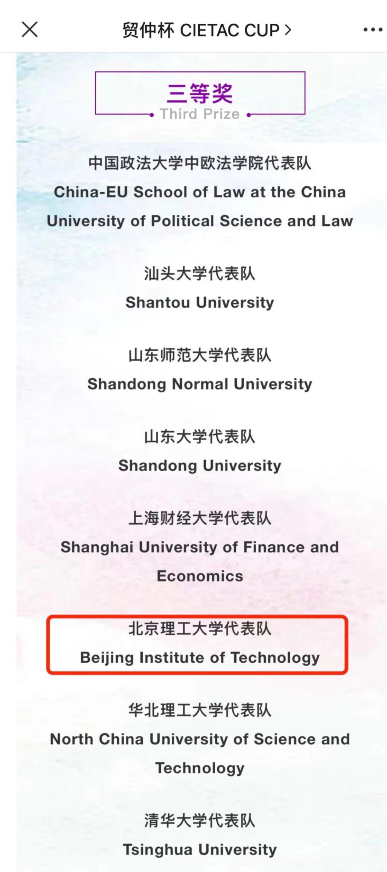 2021年12月2日晚,第十九届“贸仲杯”国际商事仲裁模拟仲裁庭辩论赛落下帷幕。经过激烈角逐,beat365中国官方网站代表队从75支参赛队伍中脱颖而出,研究生李维周、吴雨霖和tatia同学担任辩手的北理工beat365中国官方网站团队荣获三等奖,研究生李寒俊同学获得突出贡献奖,创造了beat365中国官方网站代表队近年来参加该项赛事的最好成绩。