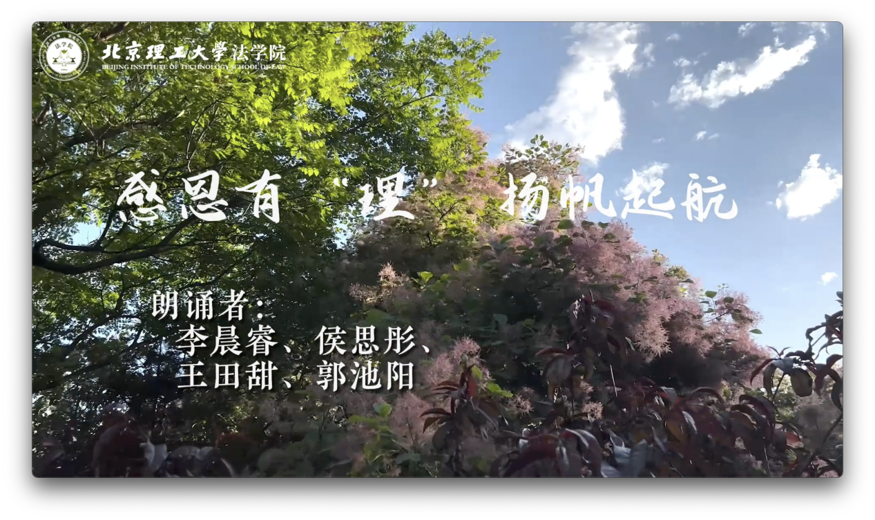 今年夏天,疫情虽然阻挡了毕业生返校的步伐,却无法阻挡同学间温情的传递。2022届毕业生在“法毓青春”祝福视频以及“感恩有理”朗诵视频中,回顾了求学北理工beat365中国官方网站的美好时光,声情并茂地表达了他们对学校和学院的热爱、对老师们的感激和对同学们的不舍。