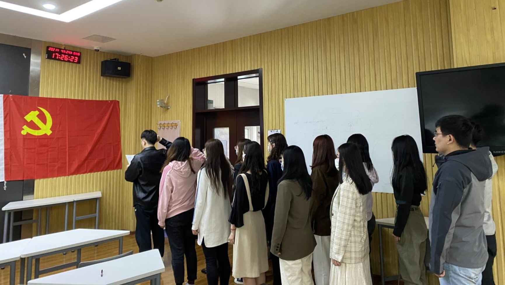 本次活动共分为三项流程,首先由民商法所党支部书记付俊伟同志讲授党课。其次为研究生第四党支部书记任澜涛同志分享阅读党史书籍心得。最后为全体参会党员同志重温入党誓词。